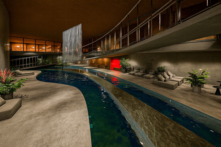 An expansive hot pool, cold plunges, infrared and traditional saunas, and a eucalyptus steam room choreograph the classic heat–chill–rest ritual. A cave-inspired ramp eases guests into the water, while the indoor/outdoor lazy river adds a signature, slow-motion circuit.